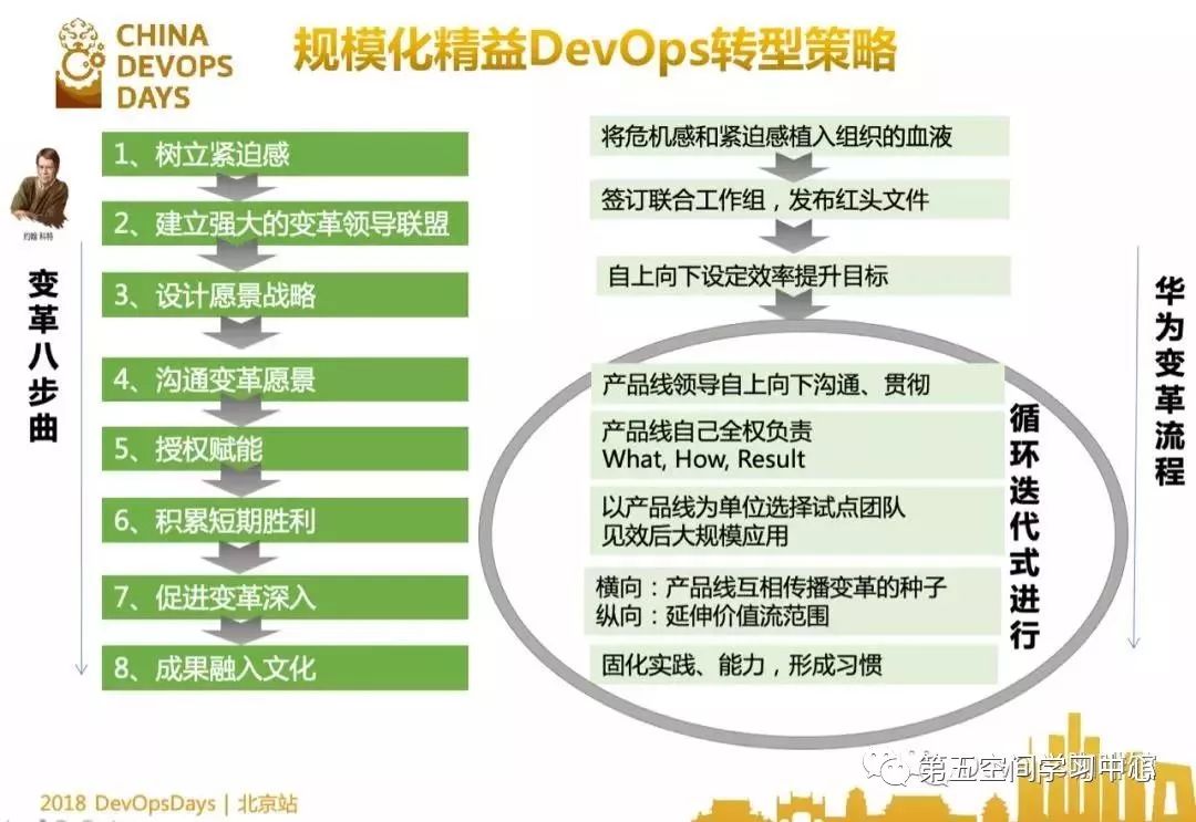 Kotter理论是这个系列中的第一个较少关注变革本身,而更多地关注其背后人(尽管是从自上而下的角度来看)的变革方法。通过激发变革的紧迫感并保持这种势头,Kotter 的理论可以很好地调整你的业务以适应当前环境。 科特的理论共8个步骤: 营造紧迫感 建立核心联盟 形成战略愿景 让每个人都参与进来 消除障碍、减少摩擦 产生短期胜利 保持加速度 将改变固化下来 其中好的地方在于,你不需要为创造紧迫感做所有的工作 — 一旦你有一个核心小组,他们愿意讨论这些变化,那么他们很可能会与其他人交谈并说服他们使其有同样改变的意愿。 评估潜在威胁、竞争对手正在做什么、以及你可以利用的机会,然后利用这些与你的团队开始讨论对公司的影响以及应该采取哪些措施。 这一步非常简单,但应该确保你拥有来自不同经验水平、技能组合的优秀人员。请务必特别要求他们对这些变化做出承诺,因为你需要一个强大的推广核心,能够接触到你业务中的每个员工。 写下变革要实现的价值、变革的内容以及预计带来的结果。将摘要总结为一两个句子,并用足够简单的语言让核心小组中的每个人都完全明白你的意思。 如果你的联盟不能用几句话来描述你所希望的变革,你就没有希望说服一线员工为什么它们很重要。 尽管定期召开会议与你的团队讨论愿景和变化是一个重要手段,但您还需要在会议之外推广这些要素。不仅如此,你不能只是将信息塞给员工,并期望他们盲从 — 你需要对反馈持开放态度,并主持有关该主题的讨论。 从本质上讲,这里的目标是让整个组织相信变革是必要的,以及为什么要进行这些改变 — 这为稍后的员工能够部署变革奠定了基础。 例如,员工可能没有使用新技术的技能,或者团队可能没有用于执行新任务的足够人力。无论问题是什么,确保尽可能解决它。 可以通过分析架构和流程来观察它们是否对变革造成了阻碍,并在问题出现后尽快解决(人和技术)。 这既能带给你的团队一种成就感,同时向他们展示了正在进行的改变,使他们更有意愿推进变化。 尽管最好提前规划这些里程碑,但你可以随时测量变革的影响,然后将该数据呈现给团队,以准确显示其绩效改变的幅度。 如果你正在努力找出任何里程碑,你还是可以随时奖励那些坚持变革、并帮助你实现目标的人。 评估您的团队所取得的任何成功(或失败),看看发生了什么以及下次可以改进的地方。除此之外,无论何时达到目标,都要确保设定新目标,让您的团队有所作为。 例如,巩固变革的一个好方法是宣布并肯定核心联盟及其对最终产品的贡献。这凸显了他们在变革中的工作,你对反馈的积极倾听,以及变革作为一个整体的正面意义。 现在要做的就是对下一轮改变重复以上的变革过程。 这可能是因为 Kotter 的大部分经验来自与大型自上而下的公司合作,但对于依赖更具协作性的公司来说,这可能是一个问题。对于大公司以外的任何公司来说,双向的反复沟通是至关重要的,因为可以从不同观点和技能组合对变化提供背景信息,并可以让员工适应变化。 Kotter首次在他的《领导变革》一书中详述了他的变革管理模型 这样说 — 如果你的公司小到你知道几乎所有为你工作的人的名字,那么你需要超越科特一步来倾听你的团队的意见。这样他们就更有可能采纳你提出的改变,因为他们至少对变革表达了自己的意见,并建立了直接的关联。 因此,与Lewin和麦肯锡的变革管理模式一样,Kotter应该补充其他方法(或者至少其中的一些元素来弥补其缺点。 也只正如前言所说,DevOps的引入可以充分借鉴变革管理模型。这里给出一个案例,关于华为DevCloud团队如何实施大规模精益和DevOps的方法。从下图的对照可以看出(左边为Kotter的变革模型,右边为对应的华为具体变革实现流程)。对应上文的分析可以看出: Kotter的模型需要将成果融入文化(反过来说,华为的执行力文化也使得Kotter模型可以成功) 华为DevCloud的大规模精益和DevOps引入对应到Kotter的变革管理模型(来源:王明兰,《华为云DevCloud 百人大规模精益DevOps转型》,2018 DevOpsDays北京站)。