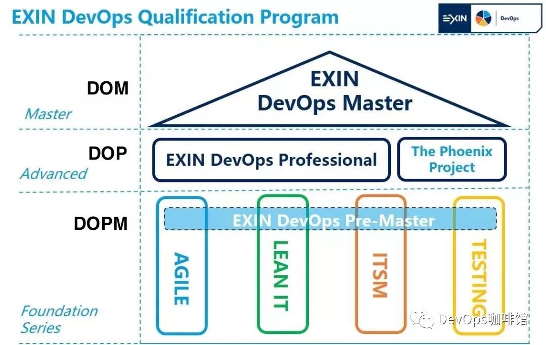 图-2: EXIN的DevOps系列认证(从下至上):DOPM,DOP,DOM